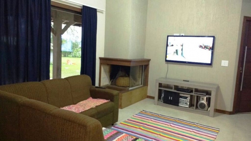 Casa com 2 quartos com ar condicionado, sendo cama de casal em cada e 1 beliche na sala. A sala possui TV e lareira. Cozinha completa: microondas, liquidificar. Varanda com rede e balanço, amplo quintal e gramado, estacionamento interno.