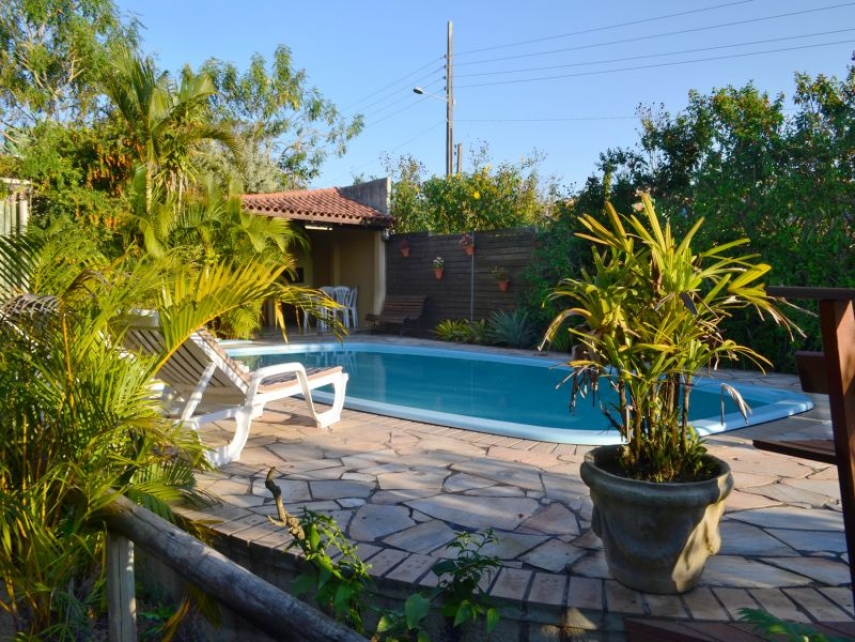 Casa em condomínio com piscina, quiosque com churrasqueira privativa, wifi e localizada a 200m do centrinho da Praia do Rosa. Casa mobiliada com capacidade para até 8 pessoas, possui com 3 quartos, 2 banheiros, cozinha completa, sala com TV e ar condicionado. OBS: Baixa temporada (exceto feriados) a piscina estará fechada.